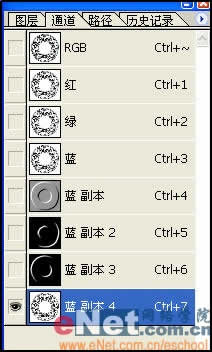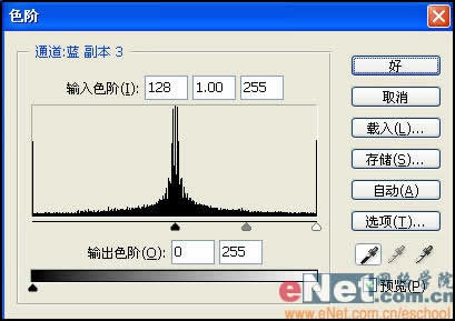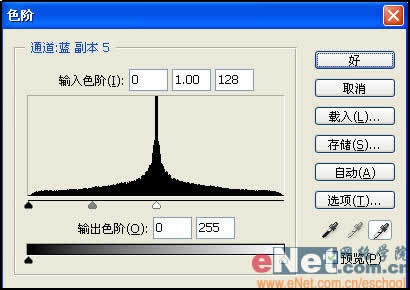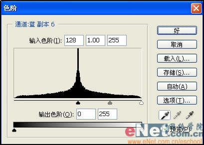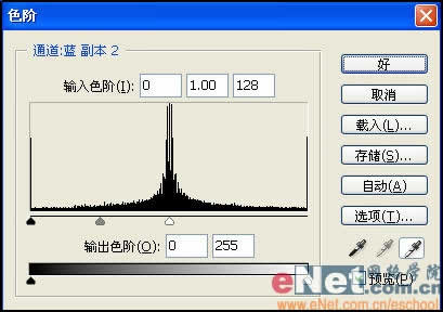 在通道中只有白色的部分才能成为被选择的部分,按Ctrl I键将通道反相,将该通道命名为B。再一次复制A通道命名为C,执行菜单栏中的“滤镜”“调整”“色阶”命令,选择黑色吸管单击图像中的灰色部分,如图所示。
