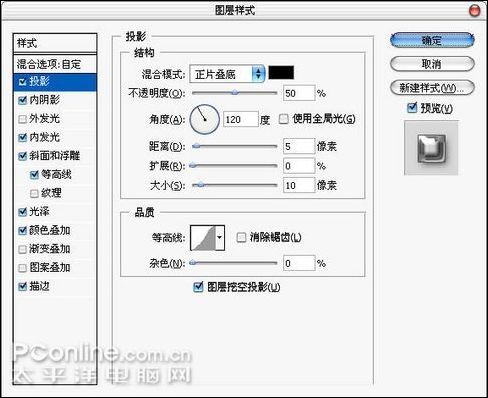 6.给图层1副本添加投影图层样式,距离5像素,扩展0%,大小10像素,其它设置参见图片。如图6所示。