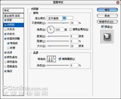 7.给图层1副本添加内阴影图层样式,距离5像素,距离5像素,扩展0%,大小10像素,其它设置参见图片。如图7所示。