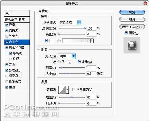 8.给图层1副本添加内发光图层样式,选择白色,阻塞10%,大小为60像素,其它设置参见图片。如图8所示。