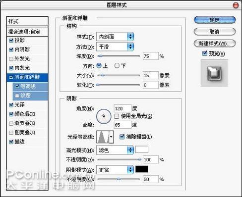 9.给图层1副本添加斜面和浮雕图层样式,大小15像素,软化0像素,其它设置参见图片。如图9所示。