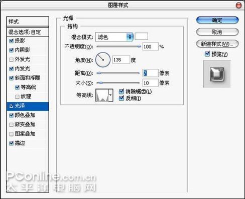 11.给图层1副本添加光泽图层样式,距离7像素,大小10像素,其它设置参见图片。如图11所示。