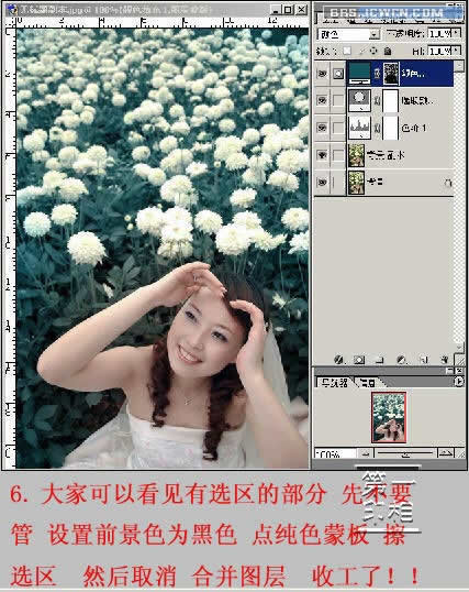 6、大家可以看见有选区的部分,先不要管,设置前景色为黑色,点纯色蒙板,擦选区,然后取消,合并图层,完成。