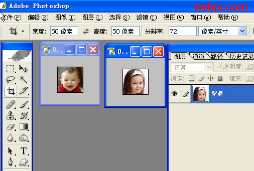 打开两幅素材图片,使用剪切工具,设置宽度和高度为50px,然后把两个素材的合适部分剪切出来。
