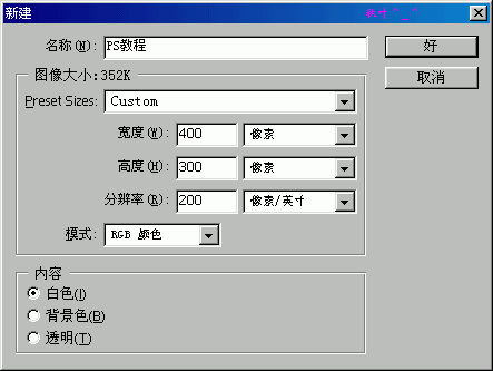 第一步:运行PS,菜单命令:文件→新建。新建一文档,属性如图一所示。
