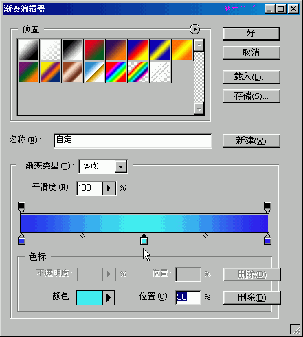 第二步:选择渐变工具,在属性栏双击颜色编辑条,在出现的面板中设置属性如图二所示。