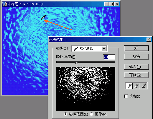 第七步:菜单命令:选择→色彩范围。以便自己随意选择要定义的颜色,单击左边的吸管在水面波纹的亮部单击,如图七所示。