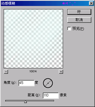 第十步:以刚才复制出的“图层1 副本”为当前图层,菜单命令:滤镜→模糊→动感模糊。设置参数为图十所示。然后选择“图层1”为当前图层,再次执行菜单命令:滤镜→模糊→动感模糊,设置参数:将角度由“45”度改为“-45”度。