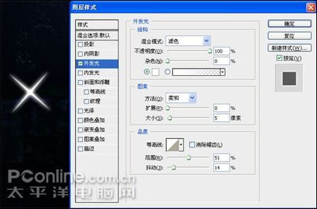 二十四、双击月亮层,打开图层样式调板,打开外发光并如下图调整参数。如图15所示。