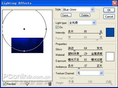 十九、在弹出的光照效果选项卡中,选择style为Blue Omnl,如图13调整相关参数及灯光位置。