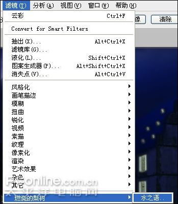二十六、在新复制出来的图层中制作水的效果。执行菜单:滤镜—燃烧的梨树—水之语,如图17所示。