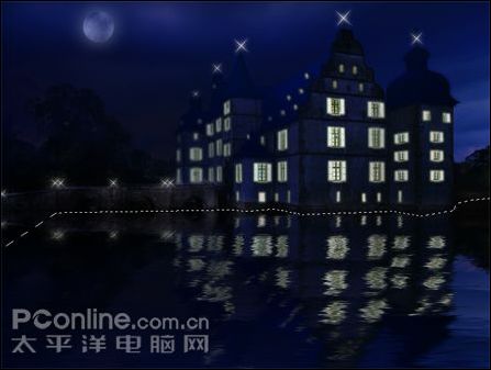 二十八、用索套选择工具,选择水面以上的部分再执行Del(清除),将不需要水面效果的部分删除。如图19所示。