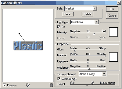 选择"text"层,然后进行过滤-渲染-光照效果-使用图四显示的值。