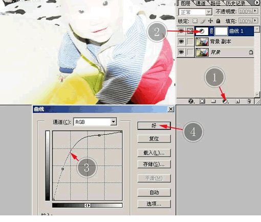 单击标签1所示的地方,选择调整层中的“曲线”命令,调成标签3所示的曲线,单击“好”。