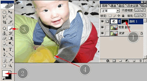 按标签2所示,将前景色变为白色。用一个比较软的画笔,在这个蒙版上阴影部分涂一涂,你会发现,所涂过的地方,曲线调整层的作用就会显现。最后再看标签1所示的地方,用画笔所涂的应该就是一块白色的区域了。