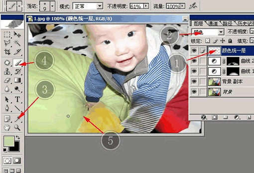 如标签3所示,用颜色取样器,在偏色的地方附近取一个正常的颜色,这里我取出了被子上的淡绿色,用画笔在颜色统一层上标签5所示的地方慢慢画出颜色,它将取代原来这里偏黄的颜色。