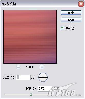 (6)执行【滤镜→模糊→动感模糊】命令,打开“动感模糊”对话框,设置“角度”为“0”度,“距离”为“275”像素,单击“确定”按钮。如图6所示。
