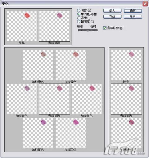 (9)选择工具箱中的【移动工具】,拖动“花瓣.Tif”文件中的图形到“蓝色魅力.Psd”文件中,图层面板自动生成【图层2】,按【Ctrl T】组合键,打开“自由变化”调节框,调整图形的大小和位置。执行【图像→调整→变化】命令,打开“变化”对话框,给图形整体添加蓝色像素,如图9所示。