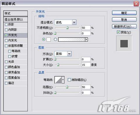 (10)双击【图层2】,打开“图层样式”对话框,勾选“外发光”复选框,设置参数如图10所示。