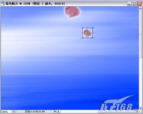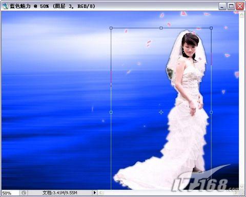 (17)选择工具箱中的【移动工具】,拖动“婚纱1.Tif”文件中的图形到“蓝色魅力.Psd”文件中,图层面板自动生成【图层3】,拖动该图层到【图层2】的下一层。按【Ctrl T】组合键,打开“自由变换”调节框,调整图形的大小和位置,如图17所示。