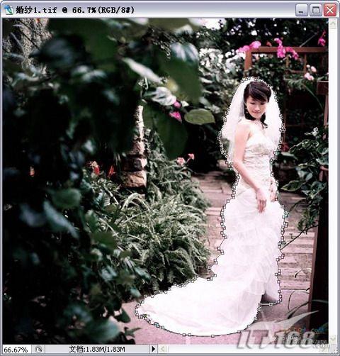 (21)执行【文件→打开】命令或按【Ctrl O】组合键,打开素材文件:“婚纱2.Tif”文件如图21所示。选择工具箱中的【钢笔工具】,在图示位置绘制路径,框选图像中的人物。