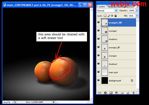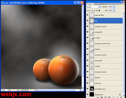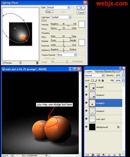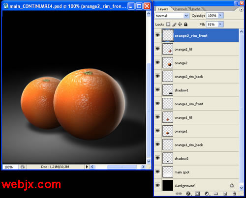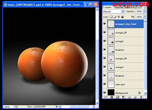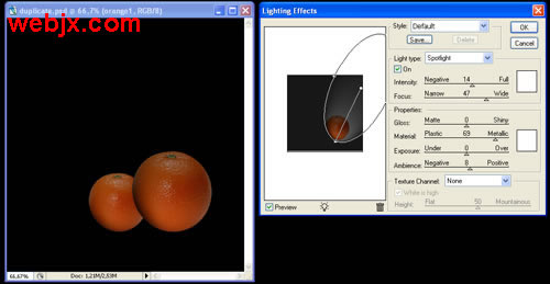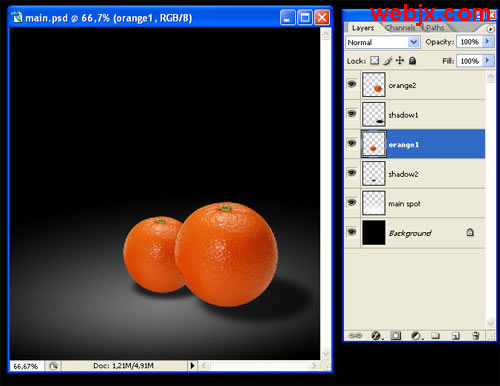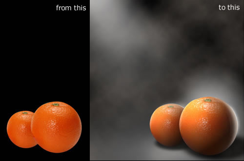 教程开始,我们先设置一黑背景,然后找两个大小不同的橘子,然后我们教程就对这两个橘子进行阴影和光线的处理。