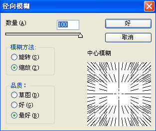 4) 滤镜 -> 模糊 -> 径向模糊。模糊的设定为 数量: 100,模糊方法: 缩放,品质:最好。如图: