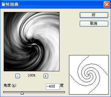 6) 按 CTRL J复制图层,然后使用滤镜 -> 扭曲 -> 旋转扭曲 设定角度为 -400