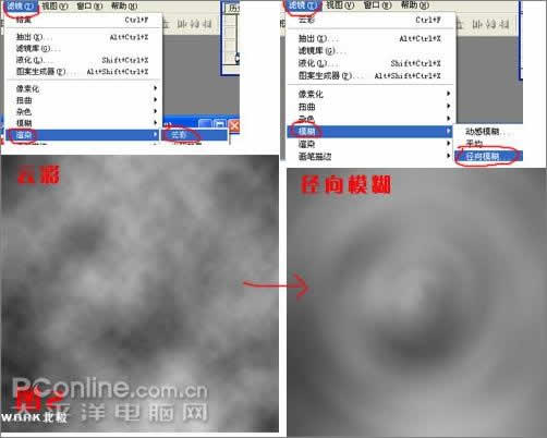 在这个材质纹理的制作中主要运用到:云彩滤镜头、径向模糊、烙黄等。