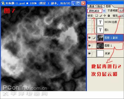 B:将背景层复制一层,改变图层属性为"线性减淡",并调整合适的不透明度;选择背景层CTRL F两次进行滤镜重复,得到图的效果。如图7。