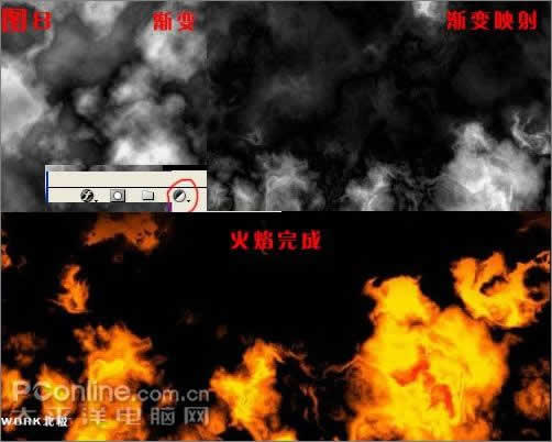 D:点 "创建新的填充或调整图层"按钮,选择"渐变映射",渐变类型选择"框",设置弹出的"渐变编辑器颜色分别为黑色、火黄、黄、红,点确定按钮退出"渐变映射"即可完成第一张火焰素材的制作。如图8。