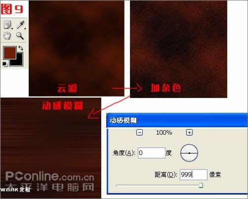 C:给木板增加纹理。执行菜单---滤镜-模糊-动感模糊,设置角度为"0度",像素为300。这样得到如图的木材纹理。如图9。