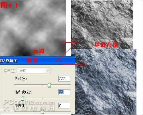 C:执行菜单-滤镜-素描-基低突现,调整细节为14,平滑为2,光照为右上,点OK。然后执行菜单-图像-调整-色相/饱和度,选取右下角的"着色",然后将"色相"调整为220,饱和度调整为15,即可得到岩石的颜色,当然大家也可以根据要制作材质的实际情况来选择颜色,如制作沙漠中的石头就要选红一点。如图11。