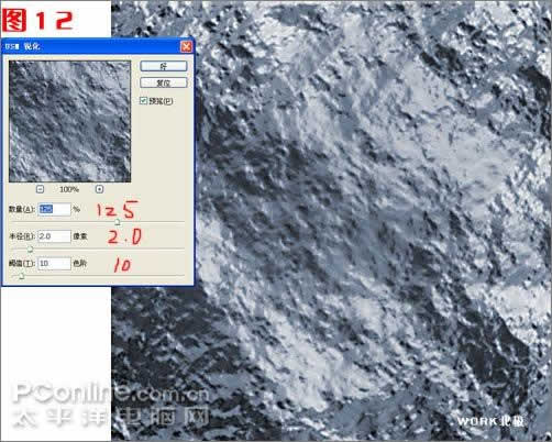 D:为了增加岩石的锐利感,我们要进行一些锐化。执行菜单-滤镜-锐化-USM锐化,调整数量为125% ,半径为2.0,数值为10,OK即完成!如图12。