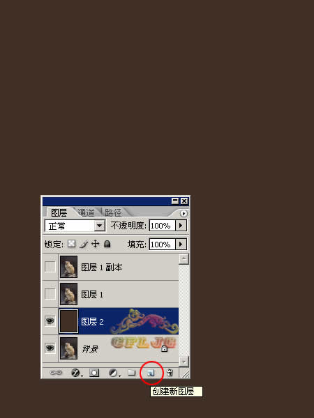 02、点击红圈处,新建图层2放于图层1和背景层之间,作为检查效果和新的背景层,并填充颜色,为体现抠图后显示微细的毛丝效果,应尽量选择较深一点的颜色。
