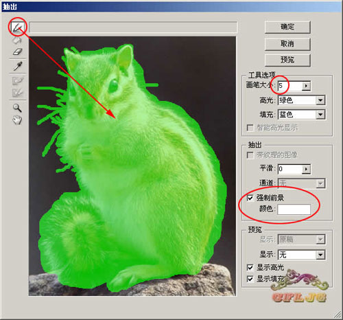 03、在图层1执行滤镜--抽出命令,在强制前景处打勾,颜色定为白色,用高光器工具涂抹绿色,中间大面积处可用大一点的笔触,主体外的胡须部分可用小一点的笔触,这里选择5。