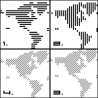 选择“Select”-->“Color Range”,在对话框中选择地图的黑色部分。按“OK”后可以将地图当选区载入。这时地图层就完成它的使命了,可以将该层删除。建立一个新的图层,选择颜料桶工具,在选项条将填充方式改为图案填充(Pattern),并在图案列表中选择先前建立的点阵图案。用颜料桶的光标在世界地图状的选区内点击一下,然后取消选择,一副数码点阵化的世界地图就完成了。