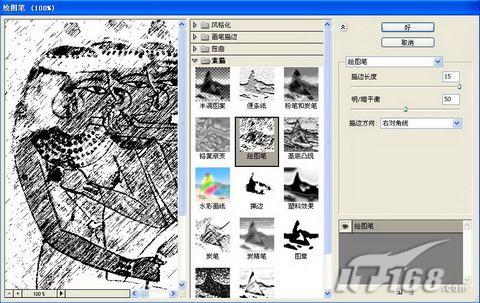 3、执行菜单栏中的“滤镜”→“素描”→“绘图笔”命令,在弹出的对话框中设置描边长度为15,明暗平衡50,如图02所示,图像效果如图03所示。