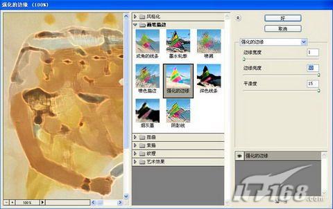 5、在图层面板中取消背景副本的隐藏,执行菜单栏中的“滤镜”→“画笔描边”→“强化的边缘”命令,在弹出的强化的边缘对话框中设置边缘宽度为2,边缘亮度为50,设置平滑度为15,如图05所示,图像效果如图06所示。