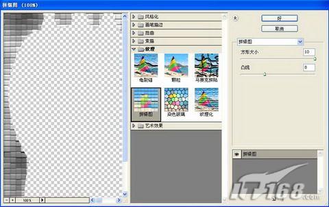 9、接着执行菜单栏中的“滤镜”→“纹理”→“拼缀图”命令,在弹出的对话框中设置方形大小为10,凸现为8,如图11所示,图像效果如图12所示。
