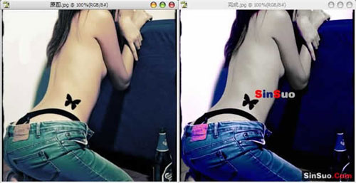 6.你可以把图层1的颜色和对比度调整下(参考本版的ps高反差效果教程),做出与皮肤对比强烈的效果.对于别的地方(如沙发,地板,瓶子)你也可以参照上面的步骤完成.