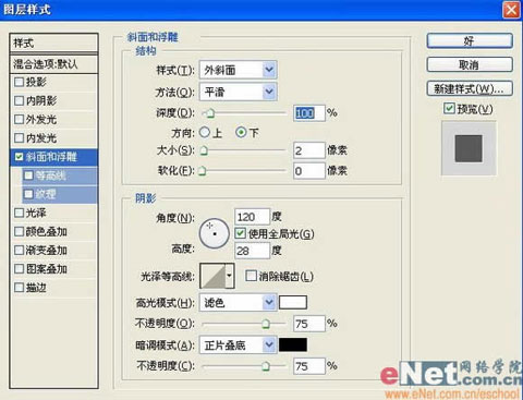 16、双击图层2,打开图层样式对话框,选择斜面和浮雕样式,设置参数如图18所示。