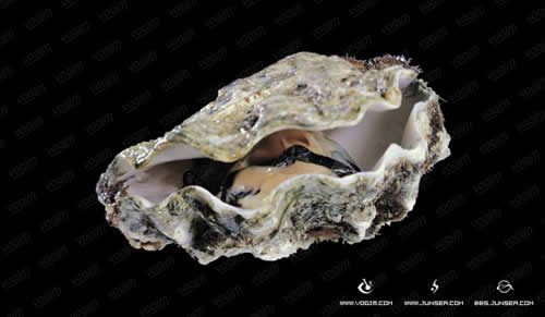 1.打开一个开口的贝壳图片(图1)。再打开一个莲花池塘的图片(图2)。将莲花池塘的图片拖移到贝壳图片的文件中。