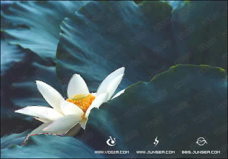 3.回到莲花的图层,将其显示,将先前勾的路径转换为选区,再执行菜单-选择-反选,将选中的图象删除(图4)。