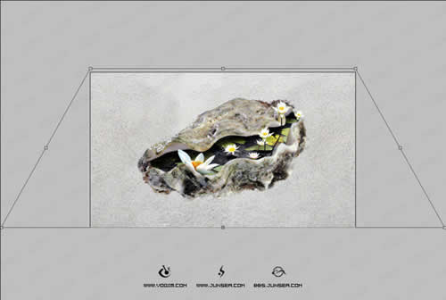 11.执行菜单-编辑-变换-水平翻转,再将此荷花的图象移到贝壳的大的凹口处,并执行菜单-编辑-自由变换,按住CTRL拖动调节变换框四个角上的节点,使荷花的形状能与贝壳的凹口更好的结合(图15)。