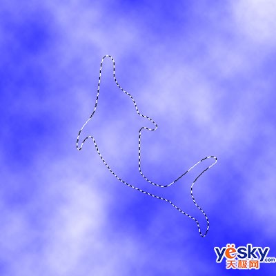 打开路径面板,调出画好的海豚路径,移动路径到色彩分布比较均匀的地方,按Ctrl Enter载入选区,再按Ctrl J复制出一个海豚图层后将云彩层填充回白色。