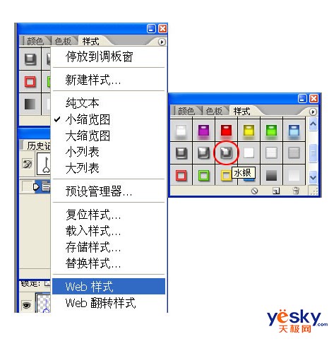 6、给吊扣添加白银的效果。打开样式面板,在样式菜单中选择“Web样式”替换当前样式后,选择其中的“水银”样式。
