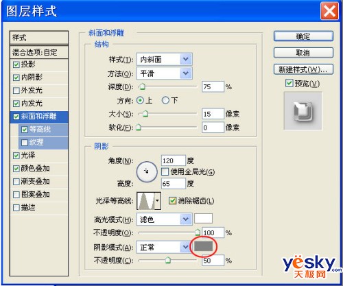 在图层面板双击吊扣图层调出其样式面板,将“描边”前的勾去掉,在“斜面和浮雕”一项中将“阴影模式”后的颜色改为R:130 G: 130 B: 130,点击即可更改。