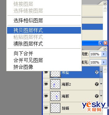 8、给挂链添加白银的效果。在图层面板右键点击吊扣层选择 “拷贝图层样式”后在右键点击挂链图层选择“粘贴图层样式”。