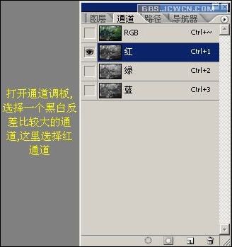 二、打开通道调板,选择一个黑白反差比较大的通道,这里选择红通道